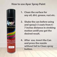| Apar Spray Paint Smoke Grey - 440 ml, is developed For Industria coatings / paintings, Electrical Panels etc for Touchup and paint rework. It can also use for general purpose, decorative, automotive, industrial, art and craft paint work over metal, plastic and wood surfaces. Its high quality acrylic resin and High performance true pigments based composition provides, Fast-drying, long lasting, High Gloss, Excellent Coverage, Corrossion Resistance, highly adhesive, durable and smooth gloss finish. Its coats are Hard, durable against heat and prevents the metal surface from rust. Available in various shades to suit different appliances, such as Car, Bike, Tractor, Cycle, Furniture, Fan, Refrigerator, Wooden or Steel Cabinet, Wall Art, Paintings etc. How To Apply: 1- Clean the surface area where you want to use the spray paint for any water, oil, grease, durt, rust etc, If Surface is rusty or non uniform, use 800 No. grit sandpaper to Smooth the Surface. To get better anti-rust performance on metal surface, apply Apar primer / surfacer Spray paint as a base coat. 2- Shake the can well. Gently press the top of the spray nozzle and direct to the target area at 6-7 Inches distance, spray the target area in stroking motion every 2-3 minutes for 2 to 3 coating till you get the desired look. Keep repeating for several times and get better effect. After use, invert the Can and press the nozzle without fail to Clean spray button, |